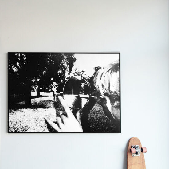 De afbeelding is opgebouwd als een collage. Hierbij gebruik ik afbeeldingen uit oude zwart wit fotoboeken. Laag op laag om diepte te creëren. Van deze collage is een afdruk gemaakt op posterformaat met een mooie matte kwaliteit. De print wordt in een stevige koker verzonden.
